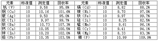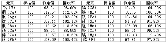 采用本方法測試潤滑油金屬含量光譜分析標準物質GBW(E)130129、GBW(E)130132,對比實際測定值與標準值,得出實際測試的回收率,得到準確度數據,結果見下表
