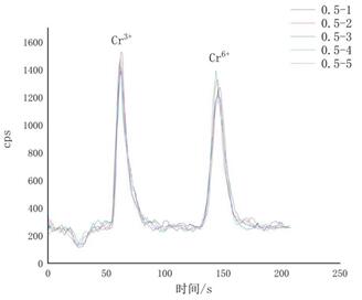 上表可知,LC-ICP-MS測試水質中Cr3+和Cr6+的重復性試驗中,定性相對標準偏差<1.0%,定量相對標準偏差≤6.0%,精密度滿足測試需求。