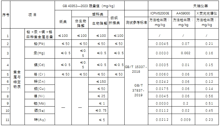 表1、重金屬與特定元素限量值與檢出限一覽表