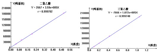 移取一定量的二氯乙酸標液(1000μg/ml)、三氯乙酸標液(1000μg/ml),配置成的二氯乙酸(濃度為10μg/ml)、三氯乙酸(濃度為5.0μg/ml)混合儲備液,再分別移取0ml、1.0ml、2.0ml、5.0ml、10.0ml的10μg/ml的二氯乙酸、三氯乙酸混合儲備液至100ml玻璃容量瓶,并加超純水定容,配制成二氯乙酸、三氯乙酸系列混合標準溶液,如下圖4 為二氯乙酸、三氯乙酸離子標準曲線圖。